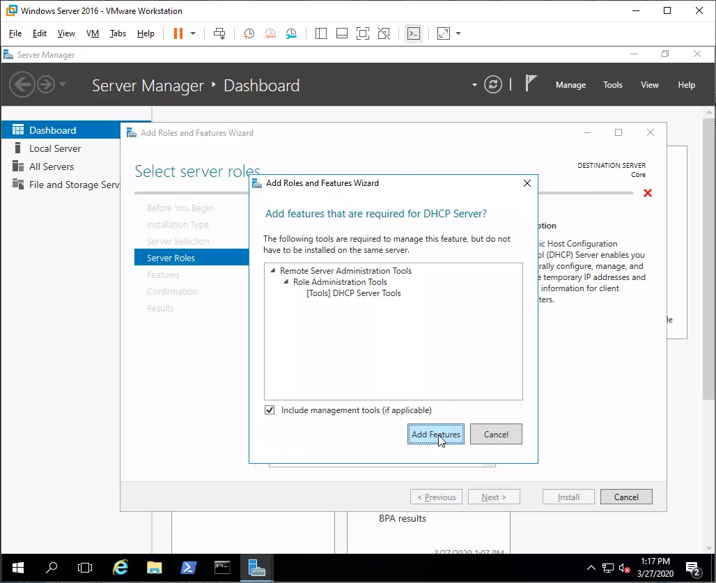 Тука освен ролята избираме и Include management tools. Това инсталира освен ролята DHCP Server и програми за управление и настройка на ролята. Add Features за продължение